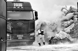 6月17日,消防官兵身穿防化服进行堵漏作业。当日,河南省濮阳县柳屯镇一家废品收购站内发生一起四氯化硅泄漏事故,导致周围草木枯萎,上百只畜禽死亡。 新华社发