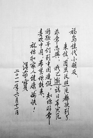 来信、图画及照片都收到了,非常高兴。我已邀请日本灾区的孩子们到中国度假,知你非常喜欢中国,希望你能来。