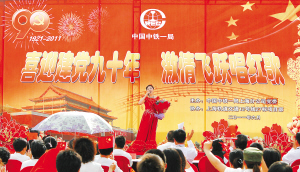 6月20日,为纪念建党九十周年,中铁一局集团上海分公司党委在上海浦东举办“喜迎建党九十年 激情飞跃唱红歌”演唱会。红歌会在《没有共产党就没有新中国》的歌声中拉开帷幕,来自上海轨道交通12号线27标项目部的员工和周边三个社区的居民150余人唱出了对党、对祖国、对社会主义的深情。 新华社记者 张明 摄