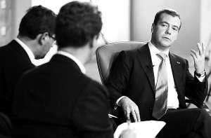6月18日,俄罗斯总统德米特里·梅德韦杰夫(右一)在圣彼得堡接受采访。 梅德韦杰夫20日说,他期望连任第二任总统,但现在讨论是否参选还为时过早。俄罗斯总统选举将于明年展开。梅德韦杰夫和普京同为下届总统热门人选,但两人迄今没有明确表态是否参加总统选举。 新华社/路透