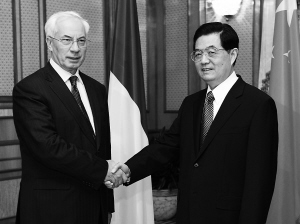 6月20日,国家主席胡锦涛在基辅会见乌克兰总理阿扎罗夫,双方就扩大和深化两国务实合作深入交换意见,达成重要共识,一致同意采取积极措施推进两国各领域务实合作,造福两国人民。 新华社记者 谢环驰 摄