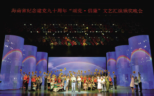 | 6月20日晚,海南省纪念建党90周年“颂党·倡廉”文艺汇演颁奖晚会在省歌舞剧院举行。图为琼海市选送的音舞诗画《风雨彩虹》。 本报记者 王凯 摄 |