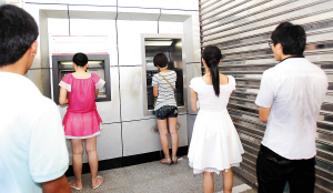 | 三亚市解放路一家银行自助取款机前,市民排队办理业务。 本报记者 李英挺 摄 |