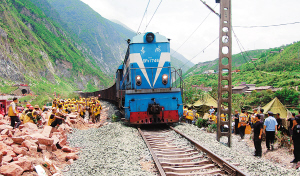 6月20日12时54分,通过成都铁路局2000余名干部职工的昼夜鏖战,因大暴雨而中断78小时的成昆铁路抢通。 新华社发