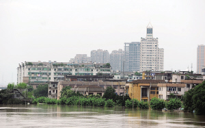 | 6月20日,兰江水位已经漫过浙江兰溪市区部分堤岸。 新华社记者 徐昱 摄 |