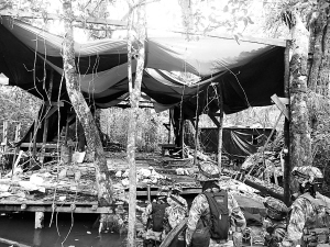 这是6月15日在哥伦比亚西南部纳里尼奥省图马科市拍摄的毒品制造码头。 哥伦比亚海军陆战队近日在该国西南部纳里尼奥省图马科市的一处河边丛林里发现了“哥伦比亚革命武装力量”用来制作古柯浆液和贩毒用半潜式潜艇的一个码头。码头设施包括3个简易厨房和两处住屋,可供40人居住生活,每月可生产1.5吨古柯浆液。警方现场销毁了全部设施和材料。 新华社发/哥伦比亚太平洋海军司令部提供
