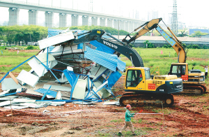 6月21日,海南省住建厅应急救援队暨海建集团应急救援支队成立及启动仪式在海口举行,350名应急救援队员接受检阅,并进行了救援工程机械应急集合演练。图为在海口市南海大道旁的演练现场,海建应急救援支队出动应急救援机械成功拆除“危房”,为救助被困群众开辟救援通道。 本报记者 张杰 摄