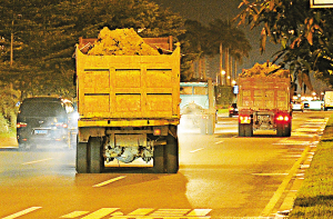↑ 6月18日21时:两辆满载红土的渣土车趁夜色上路,虽然出工地时清洗了轮胎上的泥巴,但车厢上没有加盖,一路上洒落了不少泥土。