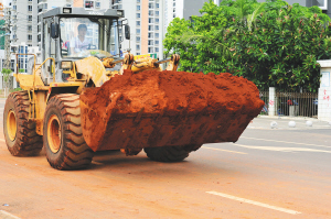 ← 6月18日9时22分:海口海甸岛环岛路上一辆铲车铲着红土在路上狂奔,一路洒下不少泥土。
