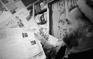 6月23日,在阿富汗首都喀布尔一家商店,一名男子观看报道奥巴马宣布从阿富汗撤军计划的报纸。 新华社发(艾哈迈德·马苏德摄)