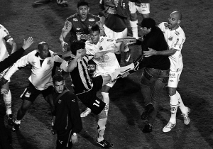 两队球员赛后大打出手 23日,巴西桑托斯队主场以2:1胜佩纳罗尔队,夺得本队48年来首座解放者杯冠军奖杯。图为两队球员赛后大打出手。 新华社发