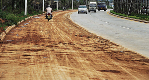 | 22日上午,海口丘海大道延长线一处工地出口路段被渣土车污染几百米。 本报记者 古月 摄 |