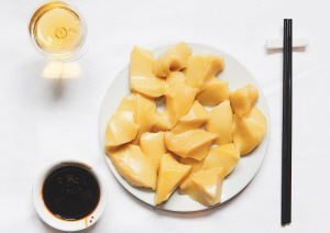 吃碱水粑之前,先用小刀把整块的碱水粑切成条状,一条条桔黄的碱水粑色泽自然,糯而不黏。