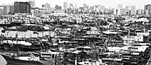 | →昔日繁忙拥挤的海口新港。图为2001年8月29日新港码头内躲避台风的船只。