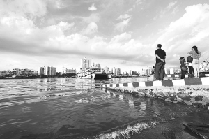 | ↑2011年6月14日下午6时,海口新港码头最后一艘客轮徐徐离开码头,一些市民站在码头上目送客轮远去。 海南日报记者 古月 摄 |