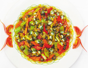 牛眼螺螺肉劲道,有嚼头,临高人喜欢用来红烧下酒。切好青椒红椒,准备好豆瓣酱,把螺用热水过一下后捞起沥水。放入油开大火,加蒜茸和豆瓣酱爆香,放入螺倒少许黄酒,快起锅时倒入芡粉,让味道沾紧螺壳。