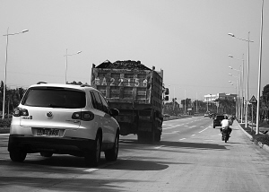 | 27日上午,海口丘海大道延长线上一辆渣土车几乎在“裸运”渣土。 本报记者 古月 摄 |