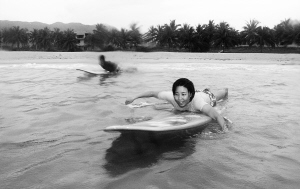 夏日冲浪 正当时 6月25日,万宁市日月湾海滩,海南大学学生夏馨正在练习冲浪。去年11月,万宁市举办了首届国际冲浪节,英语专业的小夏为活动当志愿者。当她在美丽的海湾第一次看到这充满激情和挑战的运动,就被深深吸引了。 本报记者 王凯 摄
