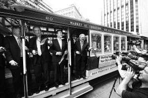 6月27日,在美国旧金山,旧金山市市长李孟贤(右一)等嘉宾为观光缆车整修工程完工剪彩。 历时半年的旧金山观光缆车全面整修工程于当天宣告完工。建于1873年的观光缆车以其独特的动力系统和古典的车厢造型成为旧金山著名观光项目之一。旧金山观光缆车主要线路上一次大规模整修于上世纪80年代初进行。 新华社发 (刘艺霖摄)