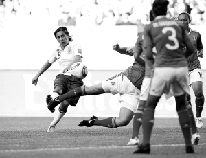 在沃尔夫斯堡阿勒公园竞技场举行的2011德国女足世界杯小组赛B组首轮比赛中,墨西哥队与英格兰队以1:1战平。图为英格兰队球员法·威廉姆斯(左)攻门。 新华社发