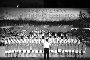 五指山市举办 “唱红歌 颂党恩”比赛 27日晚,五指山市“唱红歌 颂党恩”歌咏比赛在该市灯光球场拉开帷幕,来自全市各单位、各乡镇、省驻院校的18支代表队,以经典红歌深情大合唱的方式迎接建党90周年的到来。图为该市政府代表队在演唱《迎风飘扬的旗》。 特约记者 尹秋艳 摄