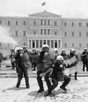 | 6月29日,防暴警察守卫在雅典的希腊议会大楼外。 新华社/路透 |