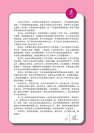 这红色记忆,是信念不衰、志向不改的崇高气节;这红色记忆,是无私无我、生属苍生的博大胸怀;这红色记忆,是敢为人先、披荆斩棘的拓荒精神;这红色记忆,是中华民族最宝贵的精神财富。它告诫我们,人事有代谢,传承无绝期。缅怀先烈精神,继承先烈遗志,是社会的道德和民族的良心,是后来者须臾不可忘怀的本分。