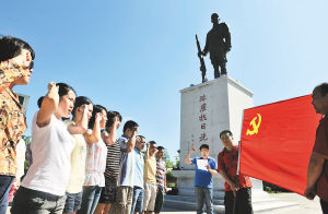 ▲7月2日,在海口市云龙镇红色革命遗址———云龙改编旧址,中国银行琼山支行的二十多位新老党员在琼崖抗日先锋塑像前缅怀先烈,庄严宣誓。 本报记者 王凯 摄