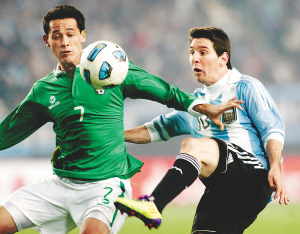 然而如此悬殊的实力差距在比赛开始后却并没有体现出来。阿根廷队在开场后踢得十分拘谨,由梅西、特维斯和拉维茨形成的锋线组合未见发威,阿根廷队中前场进攻脱节,几乎没有形成有威胁的射门,而玻利维亚队则凭借有层次的防守和阿根廷队周旋,丝毫未见下风。上半场第24分钟,阿根廷队才发动了第一次有威胁的进攻。眼看迟迟不能打破场上的僵局,阿根廷球员的情绪明显急躁起来,梅西甚至和玻利维亚队球员拉尔德斯发生激烈口角,险些动粗。上半场两队互交白卷。