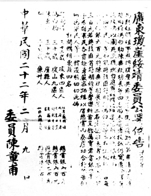 | 一九三三年二月,国民党琼崖绥靖委员公署发布公告,悬赏缉拿符明经(赏银六百元)、冯白驹(赏银六百元)、陈垂斌(赏银三百元),胡展(赏银三百元)。 |