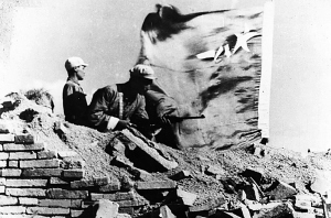 | 1950年4月,海南岛上敌人强固防御为我军所摧毁,胜利的军旗飘扬在敌“伯陵防线”上。 |