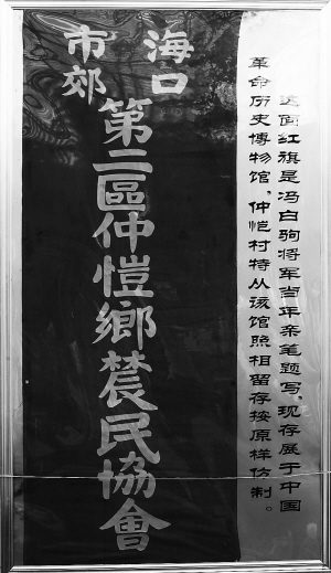 在中国革命历史博物馆中,存展的唯一一件来自海南的琼崖革命历史文物,是来自海口市灵山镇仲恺村的一面红旗,内容是冯白驹亲笔题写的“海口市郊第二区仲恺乡农民协会”十四个大字。它是大革命时期闻名全琼的一面农民运动革命旗帜,是琼崖革命“二十三年红旗不倒”最有力和唯一的历史实物见证,被周总理称为“海南的革命之宝。”