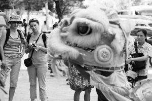 | 时值夏季,三亚“商战”红火,各种营销方式纷纷登场。在解放路街头,一鞋店开业请来了舞狮队表演。图为外国游客驻足观看。