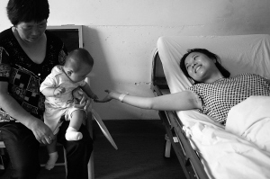 | 7月3日,躺在病床上的吴菊萍用右手握着7个月大儿子陈至轩的小手。
