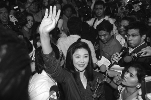 | → 7月3日,在泰国首都曼谷,泰国为泰党总理竞选人英拉·西那瓦向民众致意。