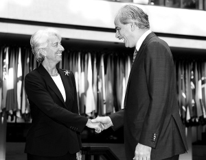 7月5日,在美国首都华盛顿国际货币基金组织(IMF)总部,IMF第一副总裁约翰·利普斯基(右)欢迎新总裁克里斯蒂娜·拉加德。拉加德当天开始上任后的首日工作。新华社发