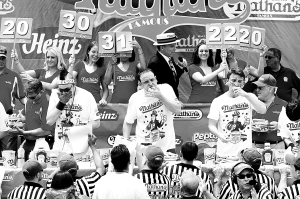 4日在美国纽约科尼艾兰举行的“内森”国际热狗速食大赛上,美国“大胃王”乔伊·切斯特纳特10分钟内吞下62个热狗,夺得冠军,实现五连冠。