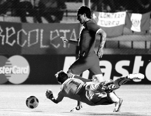 7月5日,在阿根廷圣胡安举行的第43届美洲杯足球赛小组赛C组的比赛中,乌拉圭队以1:1战平秘鲁队。图为乌拉圭队守门员穆斯莱拉救球。在另一场比赛中,智利2:1战胜墨西哥队。 新华社发