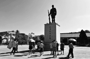 琼崖工农红军云龙改编旧址内,一棵大榕树下,两尊握手的铜像雕刻得惟妙惟肖。