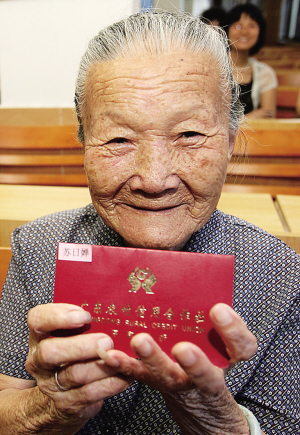 在广东省东莞市南城新基社区居委会,93岁的老人苏日蝉领到政府发放的高龄老人生活津贴(2010年7月16日摄)。 民政部部长李立国7月4日在2011年民政工作年中分析会上表示,目前全国已有14个省份全面建立高龄津(补)贴制度,惠及800万高龄老人。 新华社发(陈帆 摄)