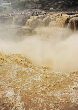 汹涌奔腾的黄河壶口瀑布(7月5日拍摄)。 受黄河上游地区降雨和万家寨水库调节放水影响,位于晋陕两省交界处黄河壶口瀑布迎来入汛以来第一次涨水,壶口瀑布水量大增,主副瀑布连成一片,形成一个特大的瀑布群。 新华社发