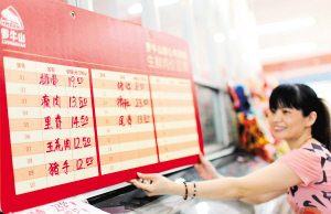 | 7月6日,海口市琼山区金花村市场罗牛山连锁超市,店员将调整降低后的猪肉价格牌摆放在醒目位置。