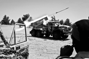 | 7月6日,在利比亚首都的黎波里西南50公里处,利比亚反对派武装向政府军发射火箭。 新华社/法新