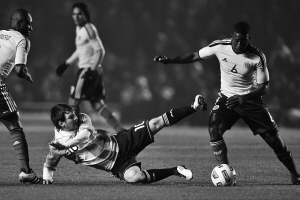 7日,第43届美洲杯足球赛小组赛第二轮开赛,阿根廷队与哥伦比亚队以0:0战平。图为梅西(下)飞铲哥伦比亚球员桑切斯(右)。 新华社发