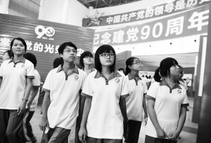 一幅幅珍贵的历史照片,一件件饱经风霜的革命遗物,诉说着中国共产党的非凡历史和今天美好生活的来之不易。7月7日,海口市会展中心举办的纪念建党90周年图片展,吸引了不少中学生前来观看。图为长流中学的学生在认真聆听工作人员的讲解。 本报记者 王凯 摄