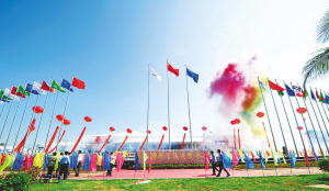 | 7月8日上午,随着彩色烟雾腾空而起,海南国际会展中心正式落成。本报记者 古月 摄 |