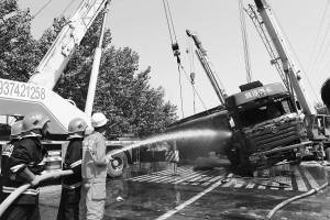 河南鄢陵化学危险物品泄漏 3小时除险 7月8日,河南省道219线鄢陵境内,一辆装载40吨化学危险品“非金属抗爆剂”的槽罐车侧翻发生泄漏。许昌市消防支队经过近3小时努力成功排除险情。 新华社发