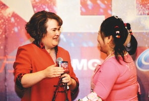 | 英国草根偶像“苏珊大妈”抵沪助阵《中国达人秀》盛典。图为7月8日,“苏珊大妈”和本季中国达人候选人“菜花甜妈”相见言欢。 新华社发 |
