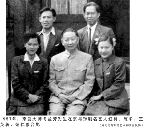| 一九五七年四月,京剧大师梅兰芳(一排中)先生在京与琼剧名艺人红梅(一排右一)、陈华(二排左)、王英蓉(一排左一)、范仁俊(二排右)合影。 |