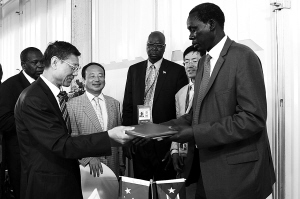 | 7月9日,中国国家主席胡锦涛特使、住房与城乡建设部部长姜伟新(前左)与南苏丹外交部长登格·阿鲁尔·库勒(前右)交换建交公报。 新华社发 |